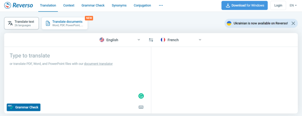 ويتيح لك برنامج الترجمة هذا أيضًا البحث عن عبارات اصطلاحية وكلمات موحية أثناء كتابة النص. ومع Reverso، يمكنك بالفعل مشاركة المعلومات المترجمة مع أشخاص آخرين عبر البريد الإلكتروني وووسائل التواصل الاجتماعي مثل تويتر وفيسبوك وما شابهها.